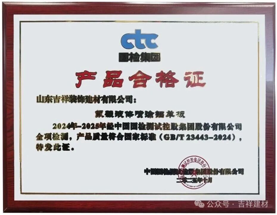 在大會備受矚目的“創(chuàng)新產(chǎn)品合格證頒發(fā)儀式”上,山東吉祥裝飾建材迎來了榮耀時刻。公司生產(chǎn)的氟碳液體噴涂鋁單板與鋁塑復合板兩款核心產(chǎn)品,經(jīng)過嚴格的評審與檢驗,雙雙被授予產(chǎn)品合格證。這份由國家權(quán)威機構(gòu)頒發(fā)的認證,是對吉祥產(chǎn)品質(zhì)量、技術(shù)工藝及性能指標的至高肯定。