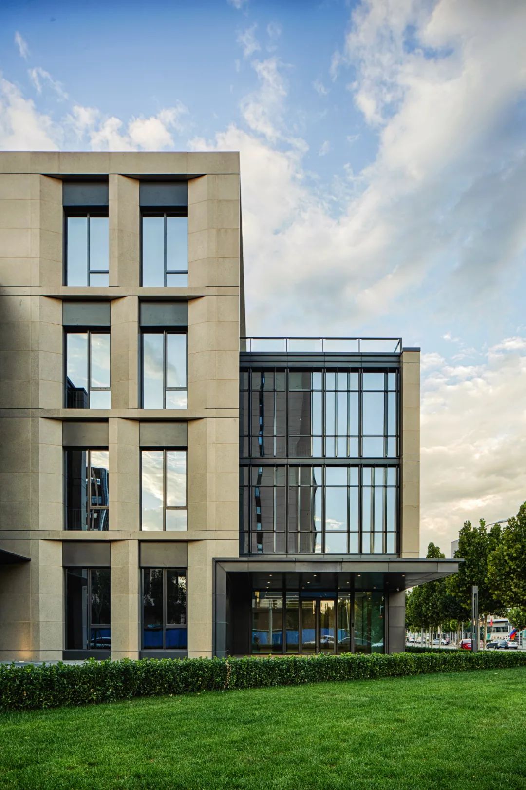 金融街·金悅中心建筑立面以米黃色仿石鋁板結(jié)合玻璃幕墻的設(shè)計手法,強調(diào)不同體塊轉(zhuǎn)換之間的虛實對比,加強折線所帶來的建筑張力,利用深灰色金屬百葉、灰色鋁板與楔形石材窗框豐富立面變化。