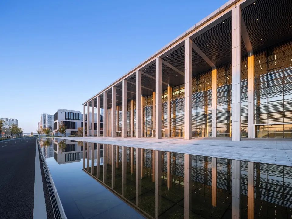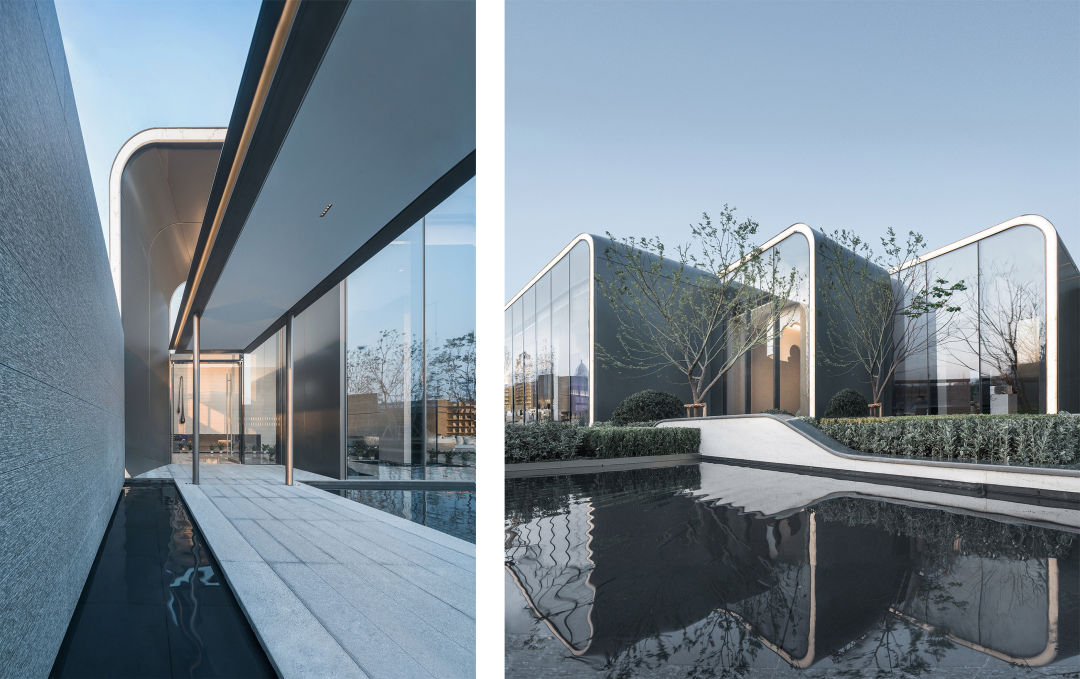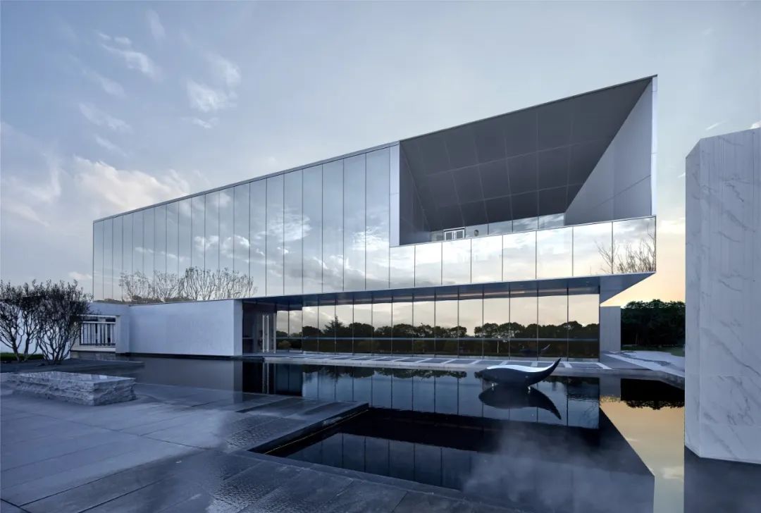 杭源里“超流體”藝術(shù)生活館,作為其概念縮影,圓角曲線的外邊緣采用超薄的蜂窩鋁板包裹石材肌理的亞克力板,暗藏有LED燈,夜晚透光,大面積超白玻璃幕墻與水環(huán)境疊加,強(qiáng)化超流體建筑的反重力感。