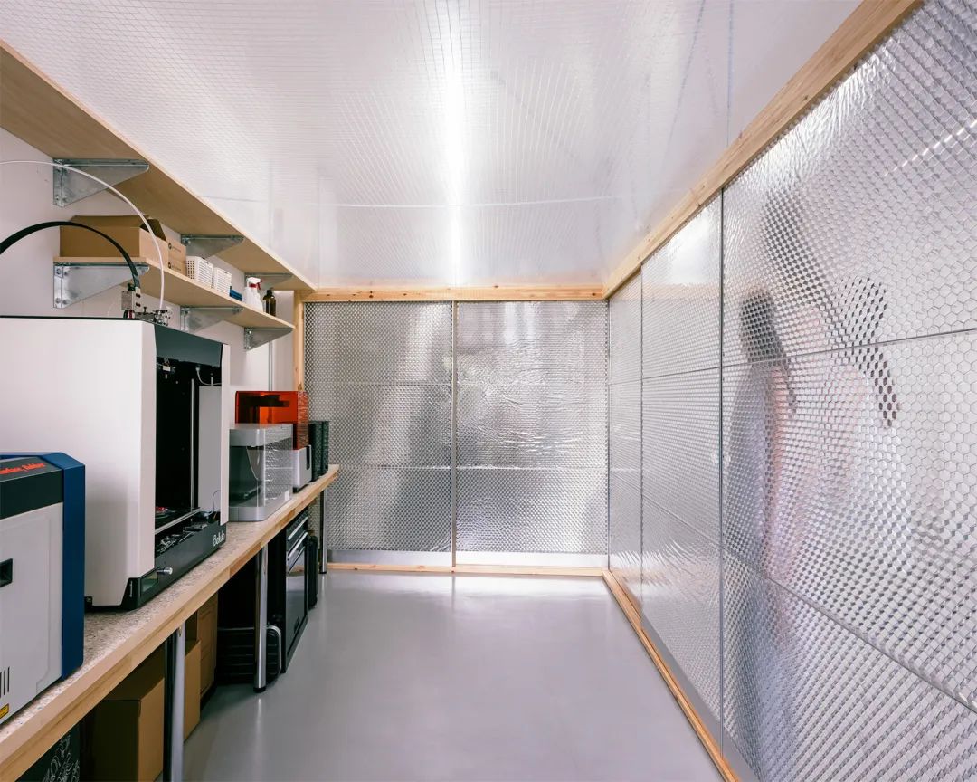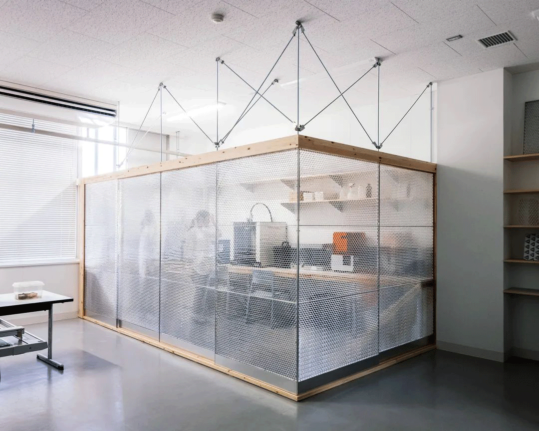 該項(xiàng)目是日本九州大學(xué)設(shè)計(jì)學(xué)院折紙工程實(shí)驗(yàn)室進(jìn)行的一次室內(nèi)設(shè)計(jì)實(shí)踐,旨在利用新開發(fā)的“折紙型”鋁制蜂窩板制作日式滑動(dòng)門,并在室內(nèi)搭建一個(gè)封閉的小型數(shù)字制造車間。
