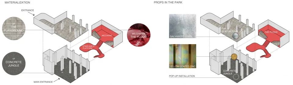 所有的材料及陳列家具,都在講述自然和工業(yè)的關(guān)系,也強(qiáng)調(diào)著在公園中”玩兒“的概念。
