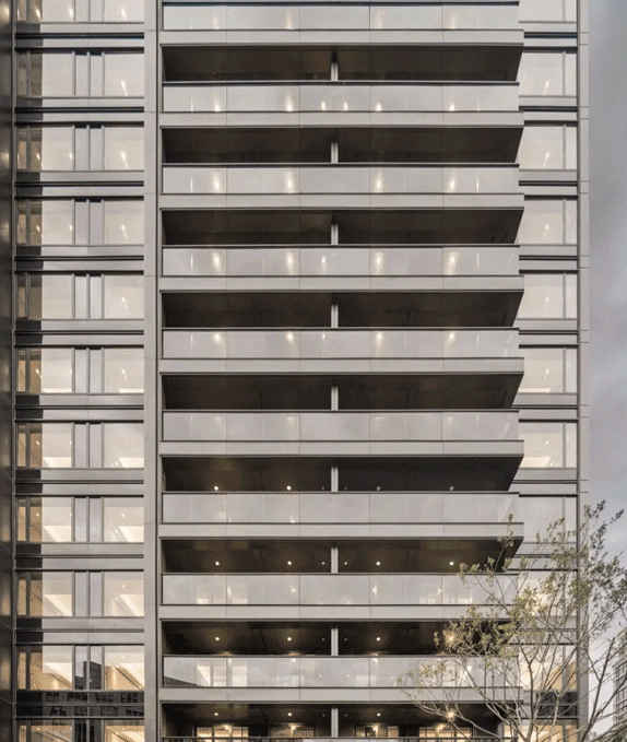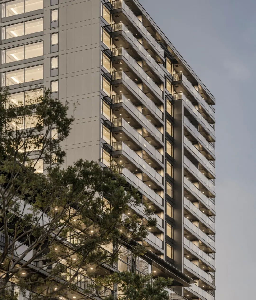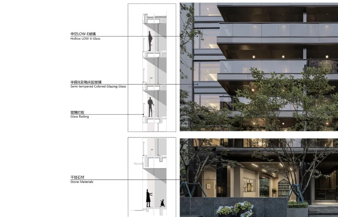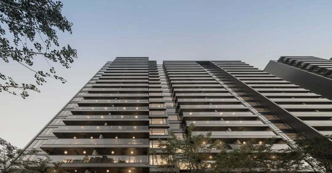 杭州沁園項(xiàng)目外立面采用了蜂窩鋁板與深色歐洲灰玻璃,利用鋁型材的細(xì)膩勾勒出蜂窩鋁板與大面low-e玻璃的通透幾何形態(tài)。