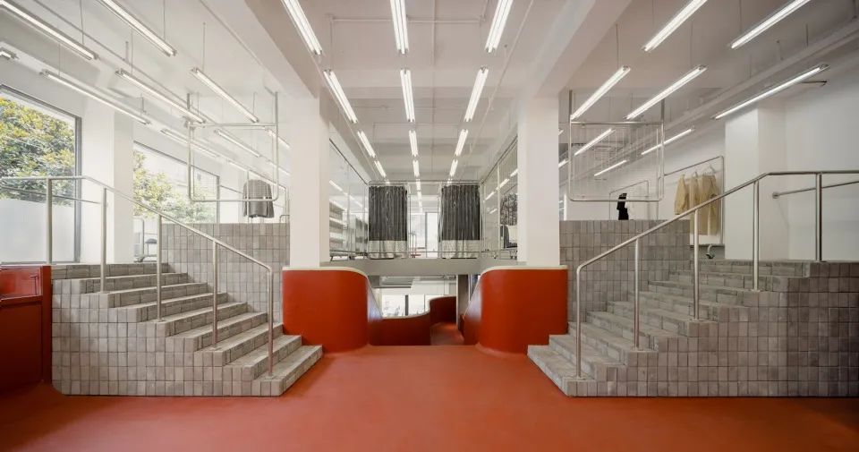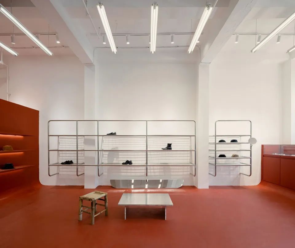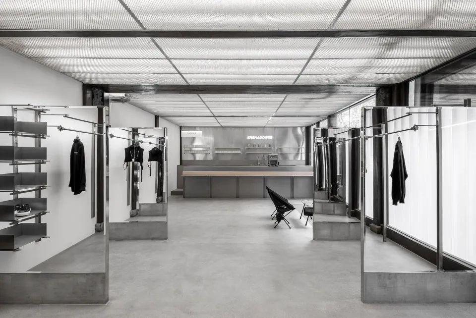 上海延平路上的in the Park門店內(nèi),輕盈且堅(jiān)硬的環(huán)形置物架輕盈由蜂窩鋁板制成,表面附上木皮和石漆,增添自然與工業(yè)的呼應(yīng)。