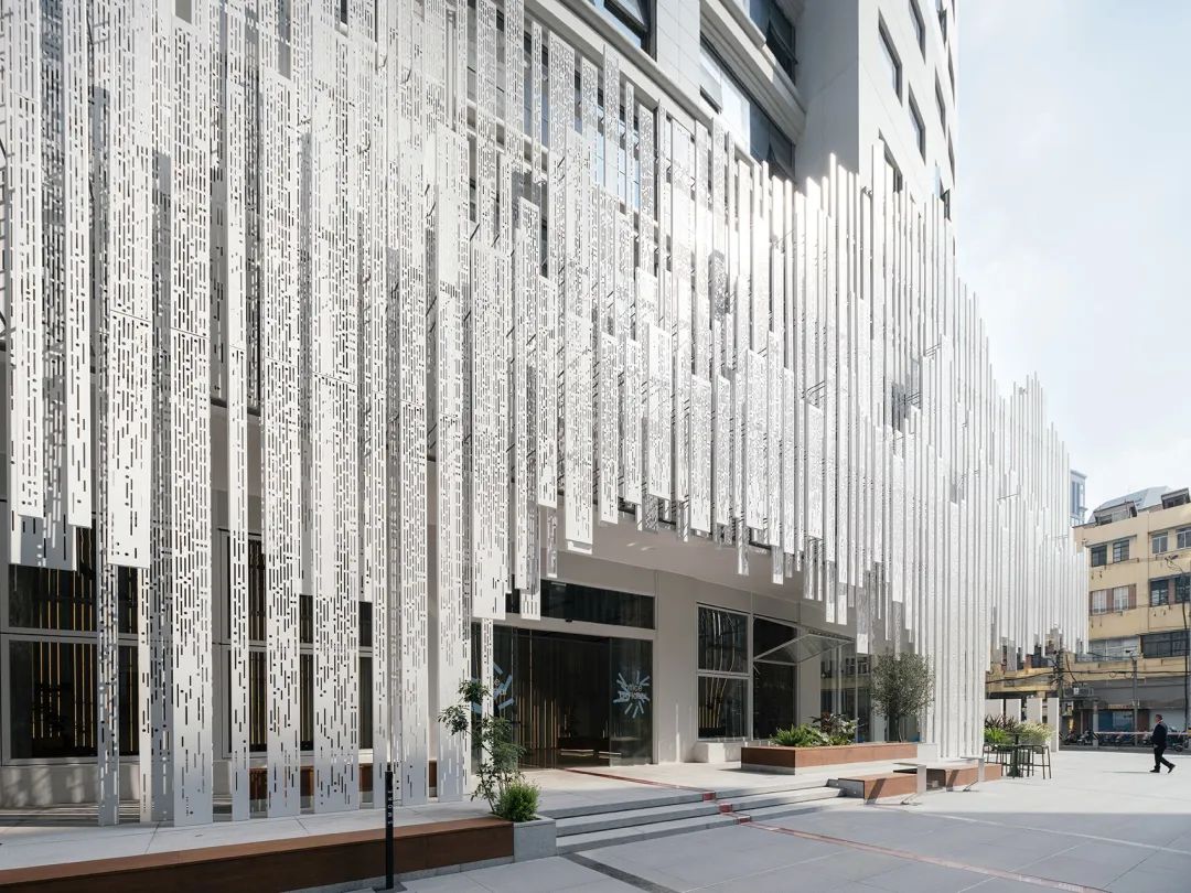 設(shè)備平臺(tái)和大塊面的外墻全部由穿孔鋁板裝飾。