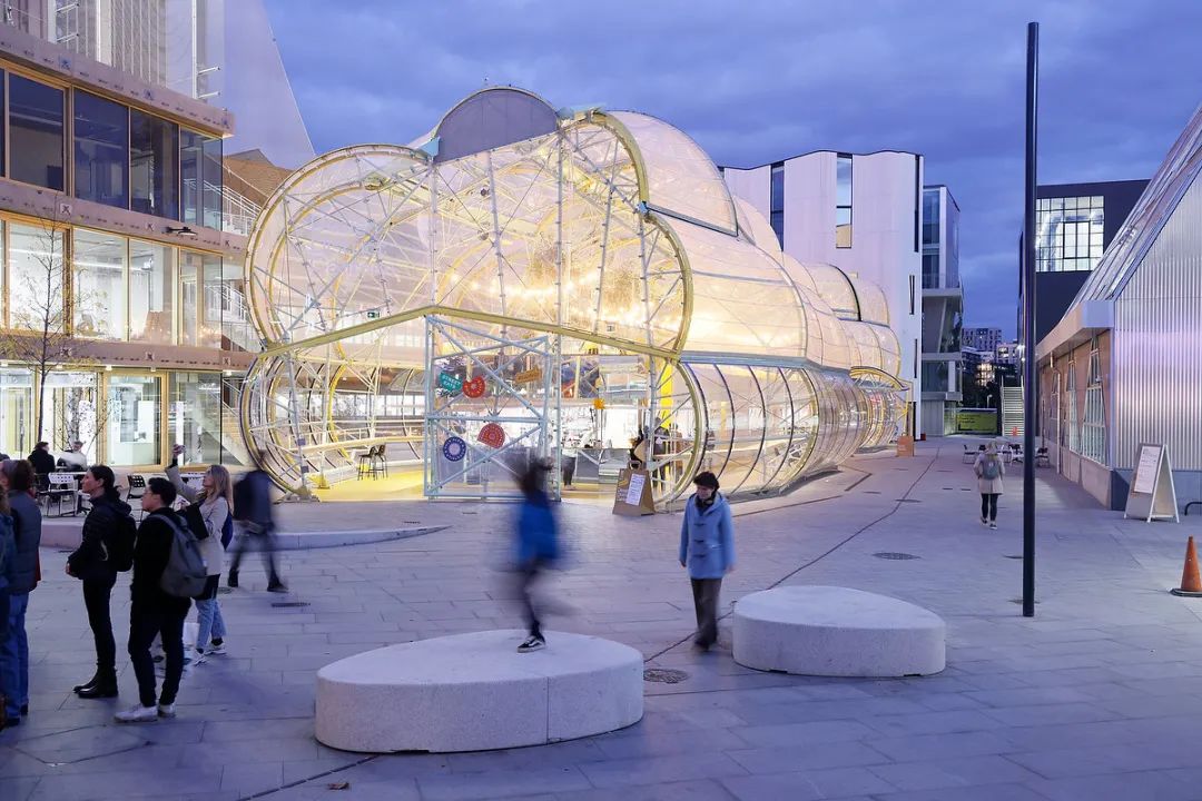 輕盈的金屬結構和透明的承重ETFE膜覆蓋著中央脊柱,攤位和座位區(qū)被設置在“脊柱”的頂端,構成了市場的核心空間。整個脊柱是用半透明的背光材料構成的,猶如一盞巨大的燈,照亮了市場與環(huán)繞著空間的ETFE膜,使其在夜晚成為街區(qū)中閃閃發(fā)光的焦點。市場的兩端均設有主要通道,同時側面也可以進入。位于底層的可調節(jié)面板以聚碳酸酯打造,可以防止涂鴉或毀壞。ETFE膜被細分至不同的面板,其中一些可以開啟以實現通風,同時營造出一種置身于街頭市場的神奇感覺。