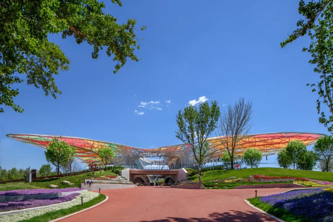 以“綠色生活、美麗家園”為主題的北京世園會很好地踐行了生態(tài)文明建設思想。媯汭劇場是北京世園會最重要的“四館一心”五大建筑之一之心,媯汭劇場同大自然的湖光山色交相輝映,夢幻的色彩充滿了蝶戀花的中國文化意境。