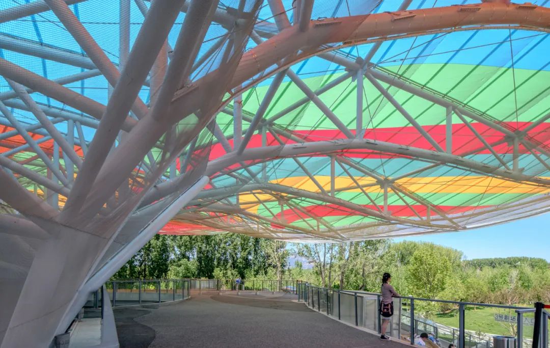 媯汭劇場位于世園會國際館北側,與中國館隔湖相望,項目總建筑面積6335平方米,建筑高度20米,主體鋼結構屋面翼展跨度120米X115米,演藝廣場主體鋼結構由26榀鋼桁架構成,主體懸挑最大達到47米。媯汭劇場的彩色遮陽屋頂下是半開放的多功能升降舞臺、座席區(qū)和集散、休憩平臺,南北向的雙層道路系統將媯汭劇場分為東西兩個部分,西側臨媯汭湖布置1000座半室外大劇場。從空中看似彩蝶飛舞,從兩端看似展翅大鵬展翅,人置身在其中又仿佛置身參天大樹下。當夜色降臨,屋頂ETFE薄膜透如蝶翼,白色的結構筋骨被燈光照射的溢彩紛呈,金屬網若隱若現,朦朧浪漫。