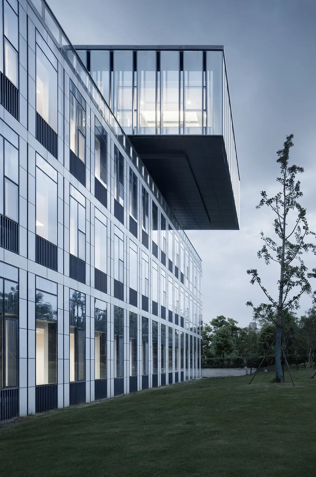 杭州錢江新城市政設(shè)施養(yǎng)護(hù)維修配套用房在材料的選用上,采用藍(lán)灰色玻璃及淺灰色石材干掛,搭配深色金屬板,打造清新明快的風(fēng)格。立面開窗采用模數(shù)化的處理方式,展現(xiàn)簡(jiǎn)潔統(tǒng)一的效果。