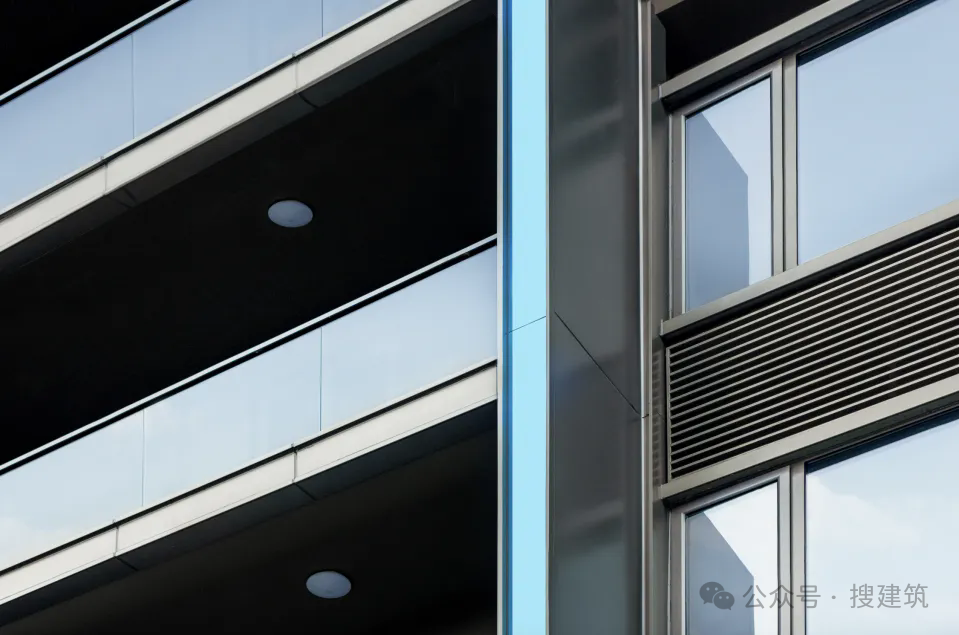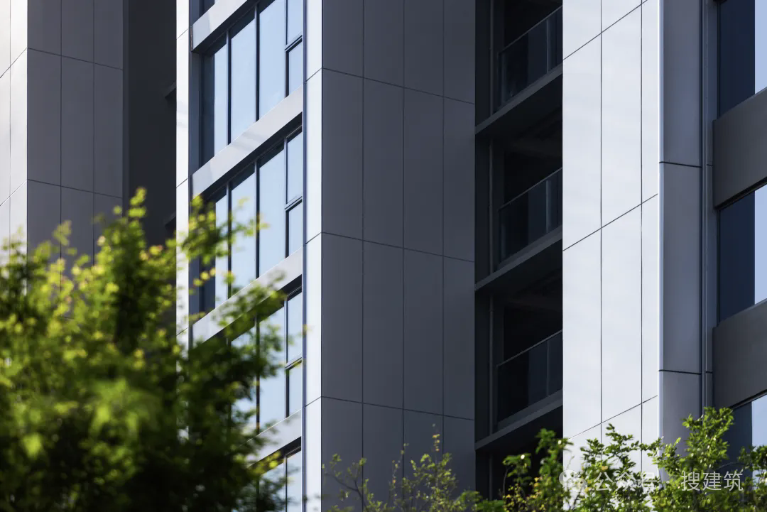 在常見銀色、深灰、米色的外立面顏色中,加入了藍(lán)色進(jìn)行跳色點(diǎn)綴,讓立面更為生動。另外外立面還使用LOW-E灰玻璃與豎向機(jī)翼形圓弧鋁板相交融,擴(kuò)大透光面的同時進(jìn)一步提升了戶與戶之間的隱私性。