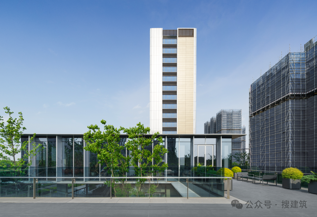 銀灰色鋁板勾勒出建筑形體,木紋色鋁板描畫線條層次,再加上傳統(tǒng)坡屋頂+小披檐元素,讓建筑外立面脫穎而出,不僅提升了整體的顏值和辨識度,更是使得整座建筑更加溫暖,消解了公建化立面的清冷嚴(yán)肅。再加上三玻兩腔Low-E玻璃,其中單塊玻璃的最大觀景尺度,就達(dá)到了235*150cm。打造出“少梁化”的空間營造邏輯,呈現(xiàn)約65%超高窗墻比,使得建筑整體更具通透大氣的現(xiàn)代審美。