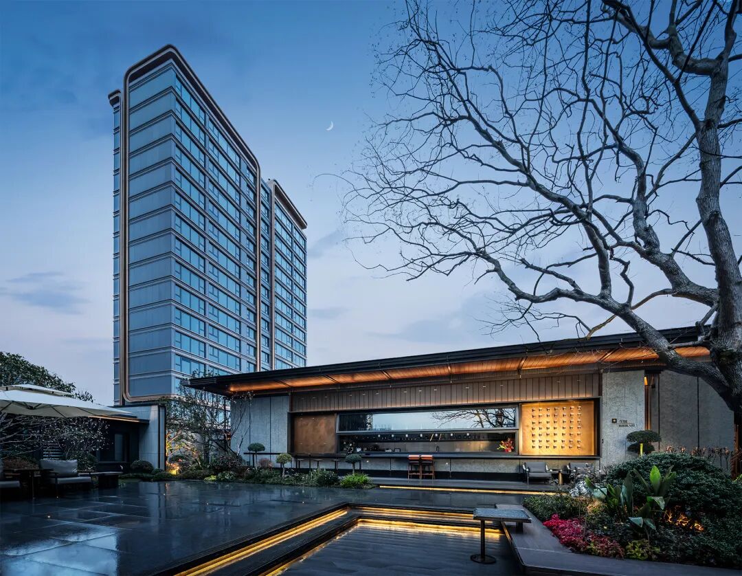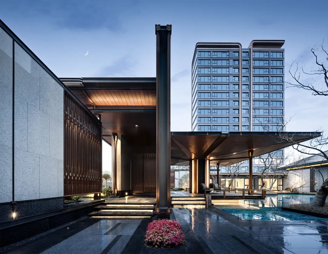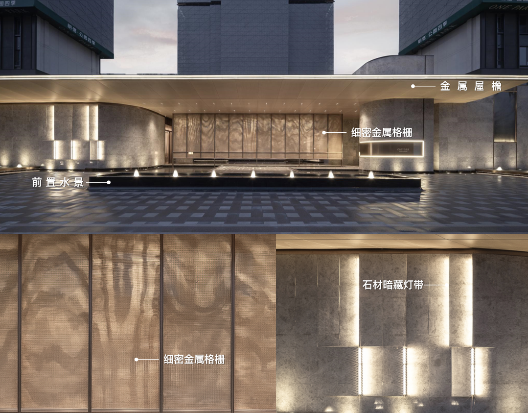 寬大飄逸的金屬屋檐由成本更高的木紋鋁板密拼而成,平整度經(jīng)得起各種角度下的陽光照射檢驗,金屬網(wǎng)編織對景屏風(fēng)與厚重奢石景墻形成視覺的中心與兩翼,配合前置水景、地面跳色鋪裝以及石材開槽內(nèi)部燈光漫反射。