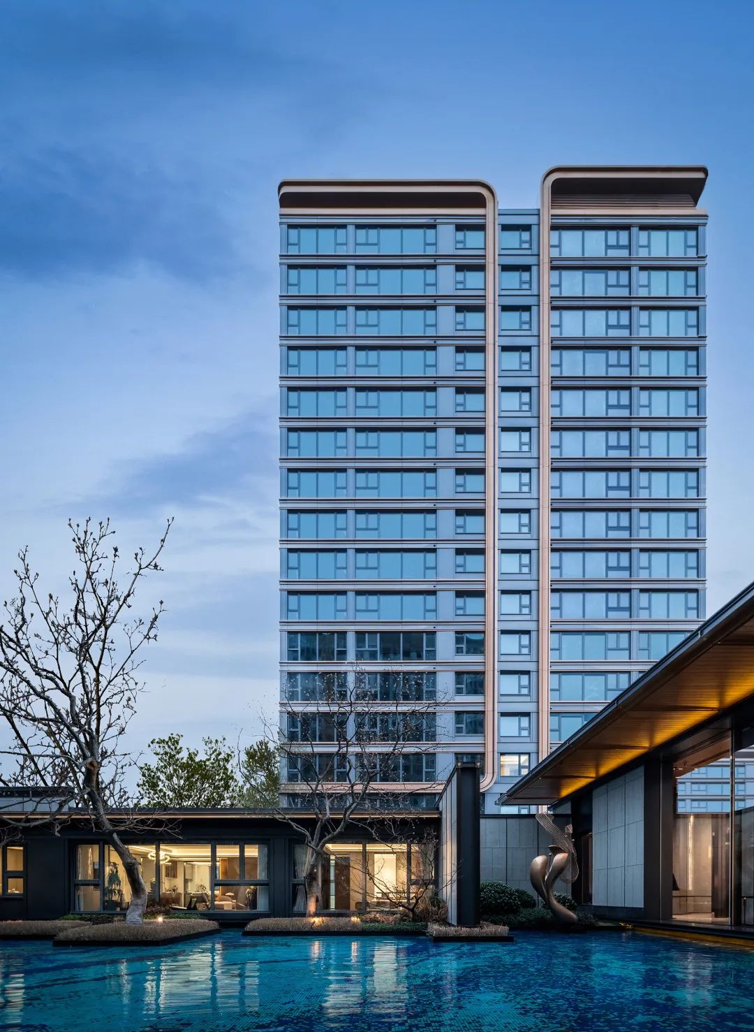 建發(fā)縵云亦如此,外立面采用「雙葉生長」雙曲弧鋁板立面,形成流暢而具有張力的曲線序列,讓弧形更靈動,僅在外觀上就拒絕千篇一律,給足了豪宅面子。