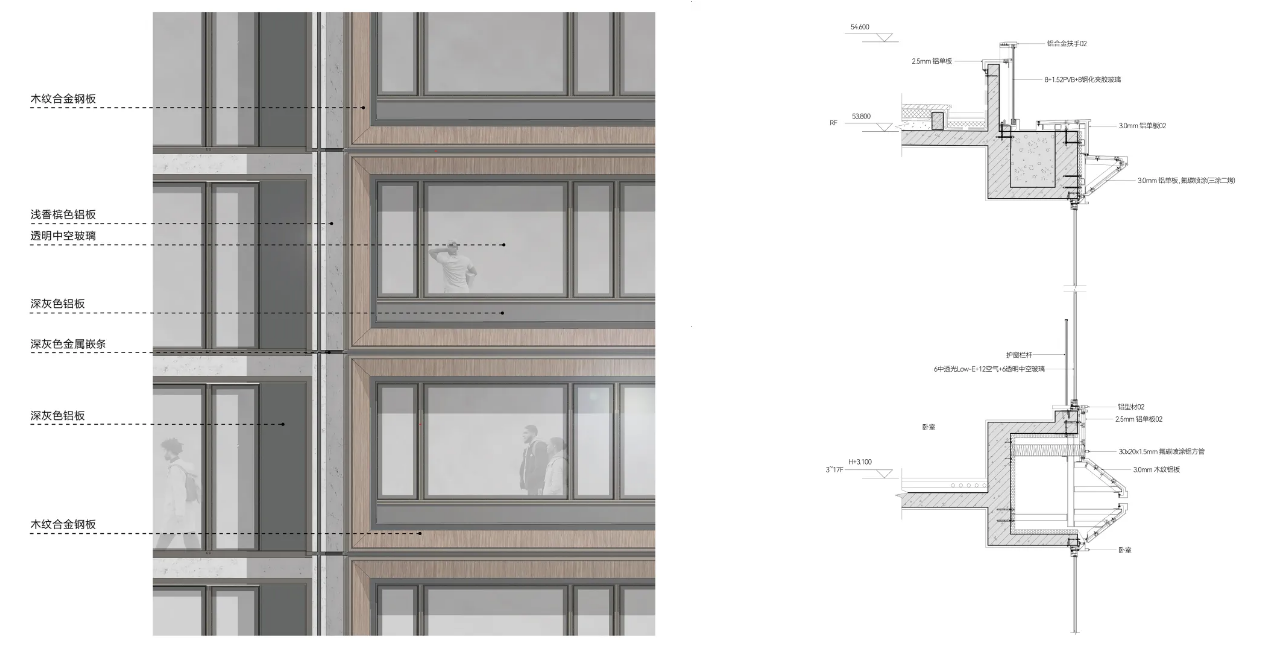 杭州濱江春曼雅廬立面采用了灰色鋁板、暖色木紋鋁板、玻璃等材料搭配,時髦、簡約。