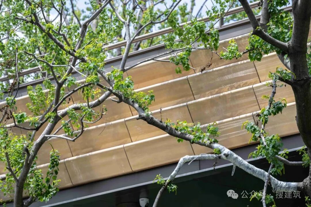 陶板的光影變化,比鋁板更豐富;陶板的質(zhì)感,比石材靈動(dòng)。橫向鑲嵌在外立面的陶板,起到了重要作用,它讓整個(gè)建筑更溫潤(rùn),更靈動(dòng)——它像愛馬仕的斜紋縫線一樣,起到的是點(diǎn)睛之筆的作用。
