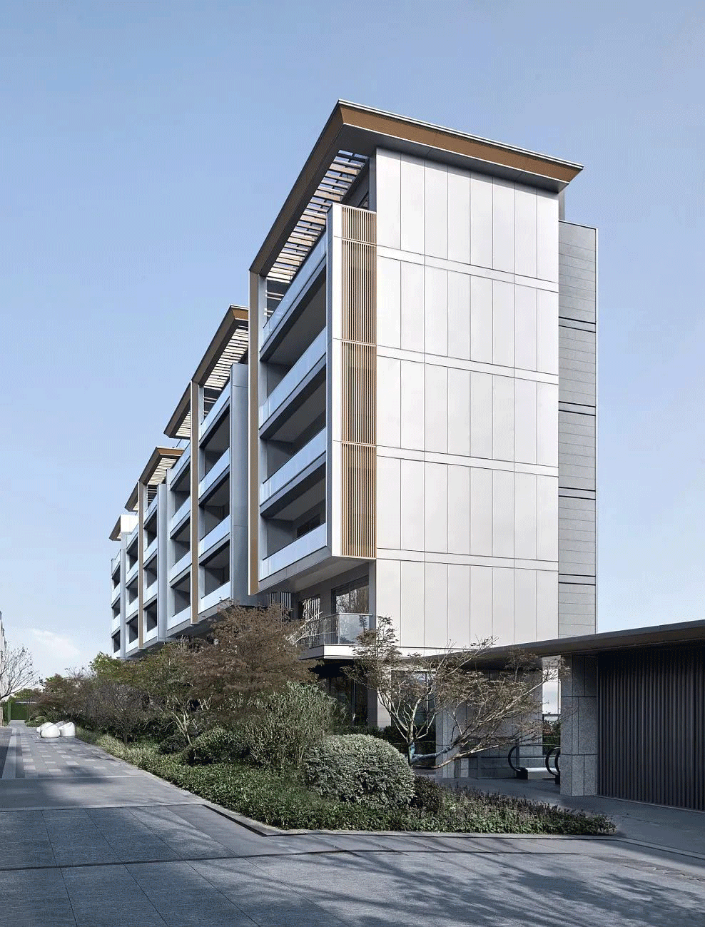 天陽眾安云棲奇嶺府外立面在玻璃與淺灰色及深灰色仿石鋁板等材質(zhì)組成。不同材質(zhì)間的對比,使建筑與環(huán)境之間形成豐富的對照關(guān)系,讓建筑成為生長自山中的新輪廓。