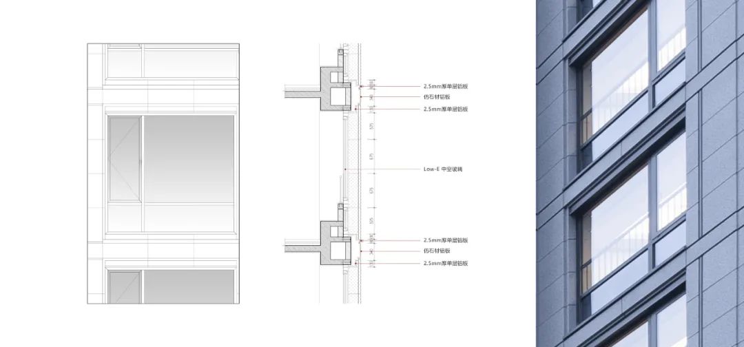 通過滾涂印刷和多次打樣,金麟府選用了效果俱佳、可以假亂真的仿石鋁單板,石材質(zhì)感增添了建筑的細(xì)節(jié)表達和價值感,同時也保證了建筑的整體性。