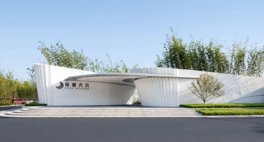 重慶瀚粼天辰項目示范區(qū)入口處打破常規(guī)設(shè)計,左右以仿石鋁板形成流動的褶皺,傾斜,轉(zhuǎn)折帶領(lǐng)游人進入。頂棚如飛來之石插入仿石鋁板中,仿造峽谷穿行中拮據(jù)的空間。