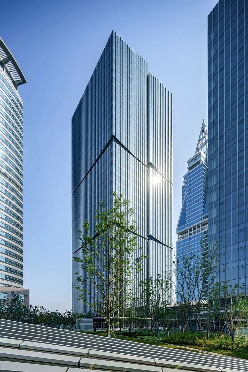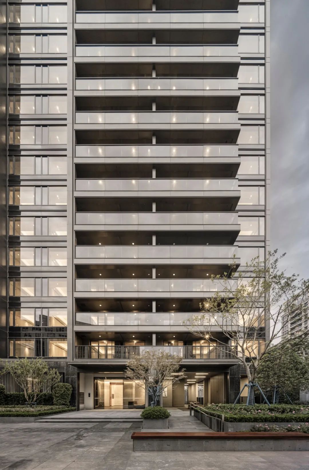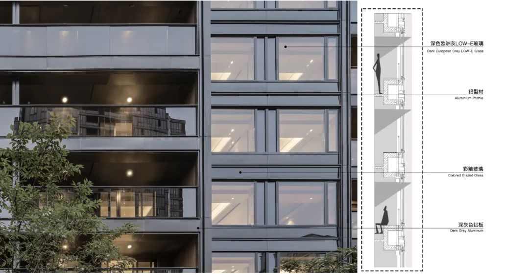 杭州沁園項(xiàng)目外立面采用了蜂窩鋁板與深色歐洲灰玻璃,利用鋁型材的細(xì)膩勾勒出蜂窩鋁板與大面low-e玻璃的通透幾何形態(tài)。