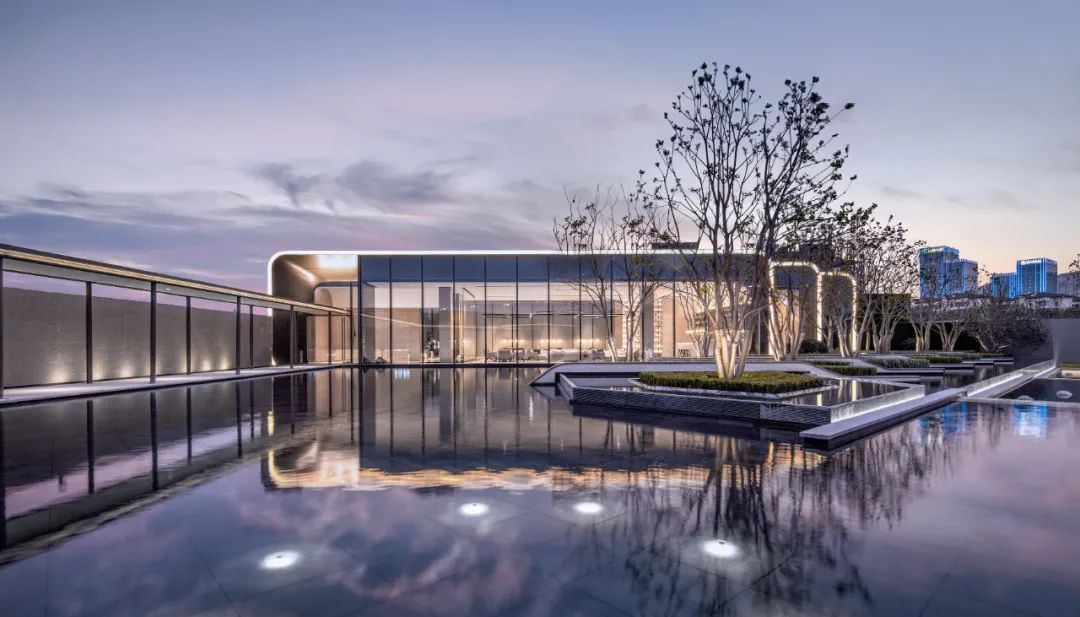 杭源里“超流體”藝術(shù)生活館,作為其概念縮影,圓角曲線的外邊緣采用超薄的蜂窩鋁板包裹石材肌理的亞克力板,暗藏有LED燈,夜晚透光,大面積超白玻璃幕墻與水環(huán)境疊加,強(qiáng)化超流體建筑的反重力感。
