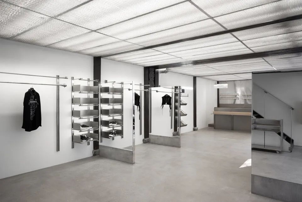 上海延平路上的in the Park門店內(nèi),輕盈且堅(jiān)硬的環(huán)形置物架輕盈由蜂窩鋁板制成,表面附上木皮和石漆,增添自然與工業(yè)的呼應(yīng)。