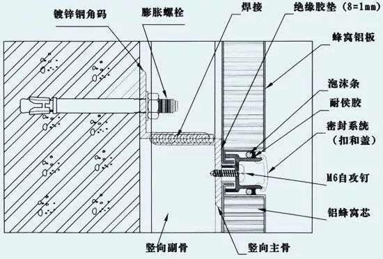 除了干掛外,常見的蜂窩板節(jié)點(diǎn)做法就是“打釘式”做法,節(jié)點(diǎn)如下所示: