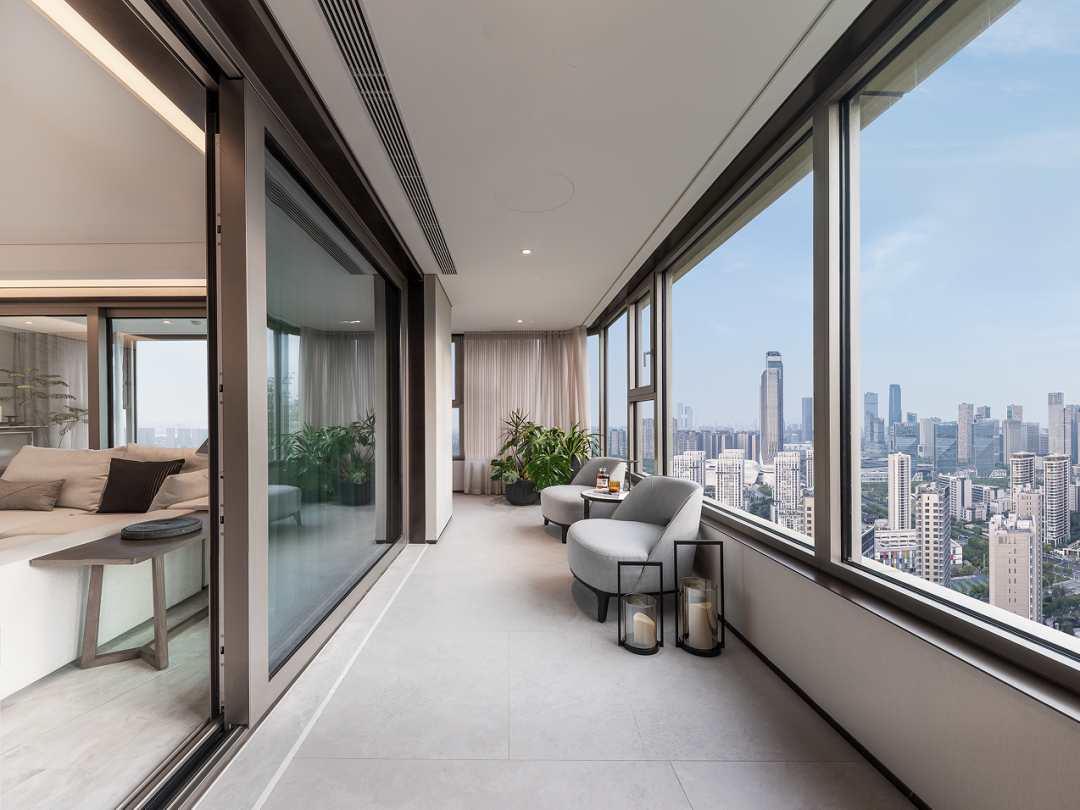 “270°景觀陽臺是中寧府的一大特色。秉持“無柱化”的設(shè)計理念,陽臺保留極少量墻體,構(gòu)成三面環(huán)繞式玻璃“環(huán)幕”,每一扇窗外都獨立成景。