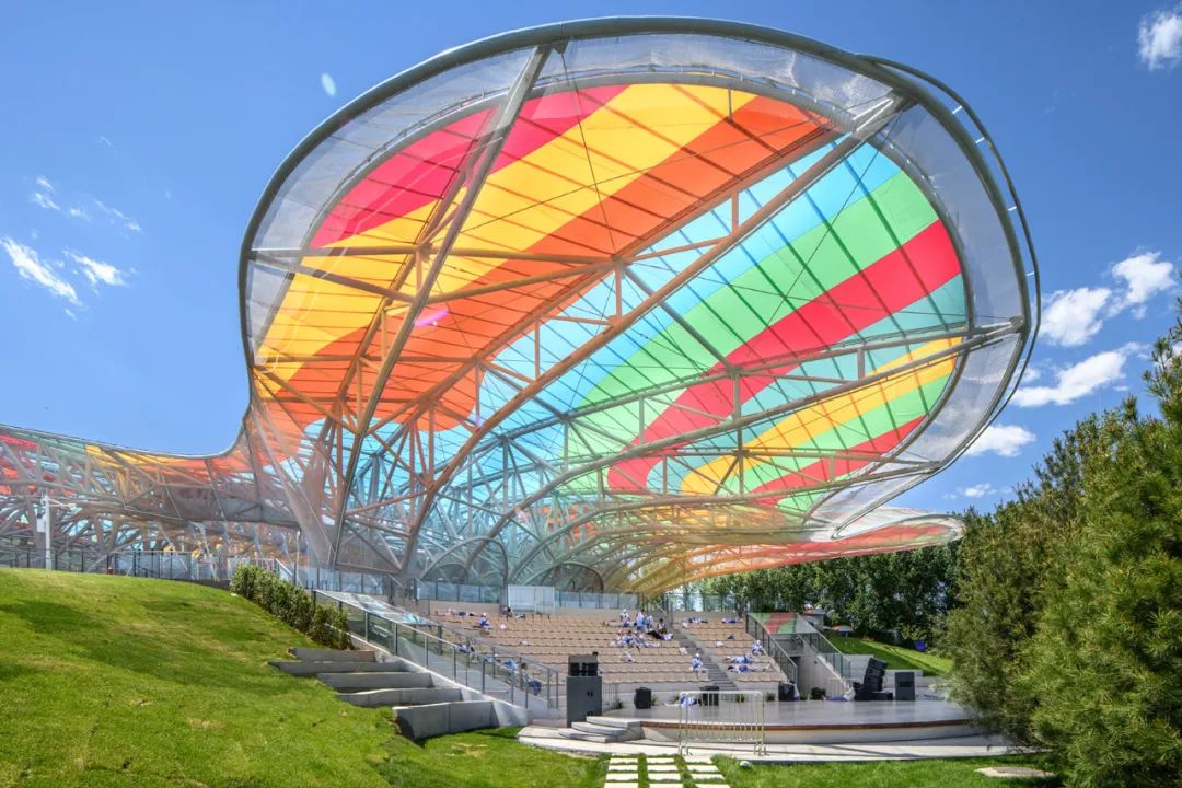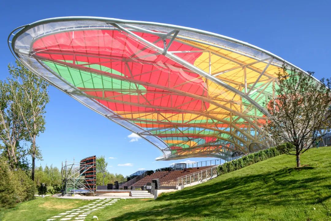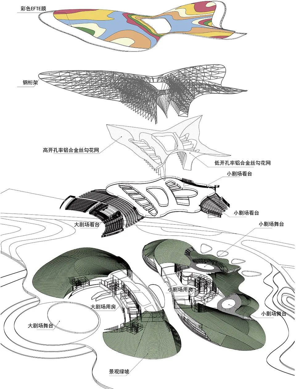 媯汭劇場位于世園會國際館北側,與中國館隔湖相望,項目總建筑面積6335平方米,建筑高度20米,主體鋼結構屋面翼展跨度120米X115米,演藝廣場主體鋼結構由26榀鋼桁架構成,主體懸挑最大達到47米。媯汭劇場的彩色遮陽屋頂下是半開放的多功能升降舞臺、座席區(qū)和集散、休憩平臺,南北向的雙層道路系統將媯汭劇場分為東西兩個部分,西側臨媯汭湖布置1000座半室外大劇場。從空中看似彩蝶飛舞,從兩端看似展翅大鵬展翅,人置身在其中又仿佛置身參天大樹下。當夜色降臨,屋頂ETFE薄膜透如蝶翼,白色的結構筋骨被燈光照射的溢彩紛呈,金屬網若隱若現,朦朧浪漫。