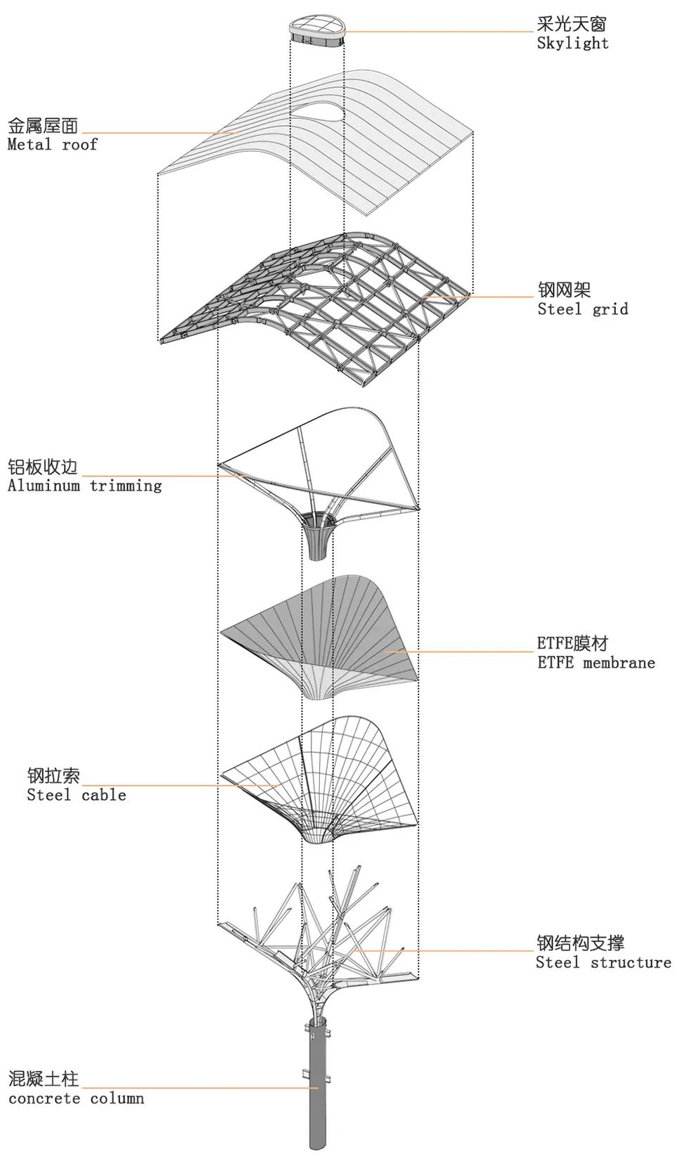 挺拔的樹狀結構與動態(tài)屋面發(fā)生最直接的視覺關聯 ?施崢