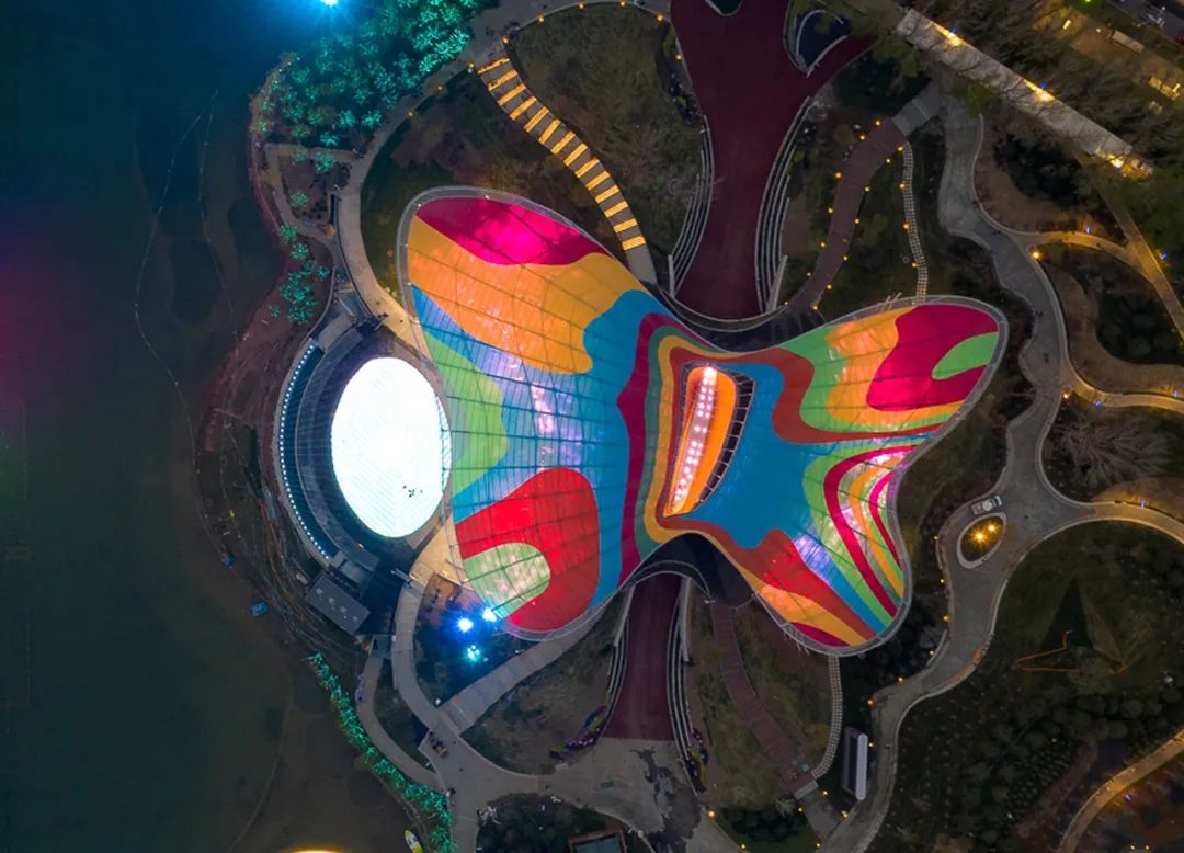 以“綠色生活、美麗家園”為主題的北京世園會很好地踐行了生態(tài)文明建設思想。媯汭劇場是北京世園會最重要的“四館一心”五大建筑之一之心,媯汭劇場同大自然的湖光山色交相輝映,夢幻的色彩充滿了蝶戀花的中國文化意境。