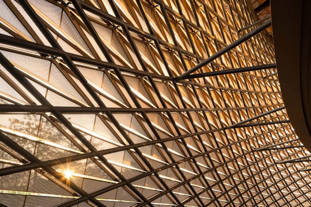 陽光透過頂部天窗灑落在“葉片”單元體腔內,光線漫射形成一個個金色發(fā)光體 ?施崢