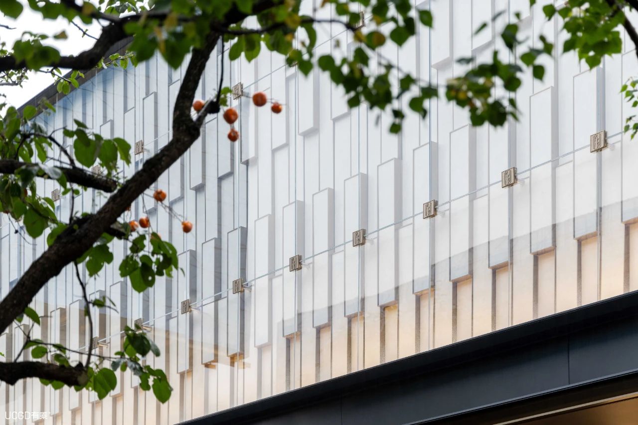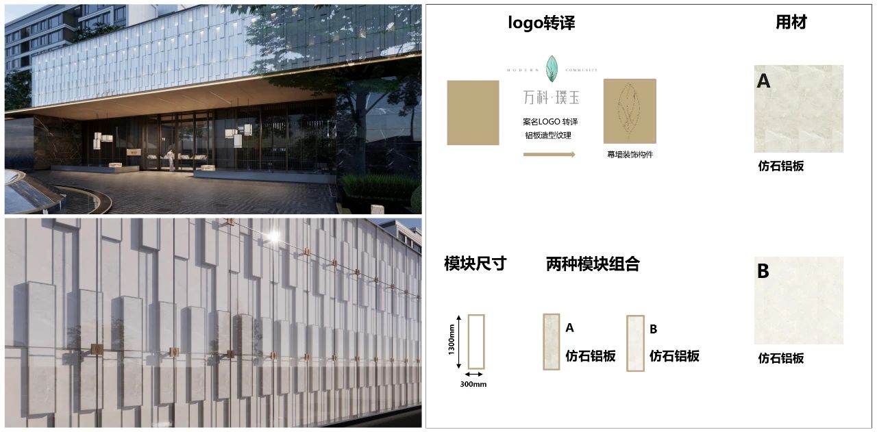 重慶萬(wàn)科·璞園示范區(qū)立面幕墻裝飾構(gòu)件,由案名LOGO轉(zhuǎn)譯成鋁板造型紋理,整體幾何形態(tài)以“玉章”為原型,選取兩種仿石鋁板模塊組合,精準(zhǔn)拿捏其比例與節(jié)奏韻律,創(chuàng)造“淡妝相宜”的建筑美學(xué)。