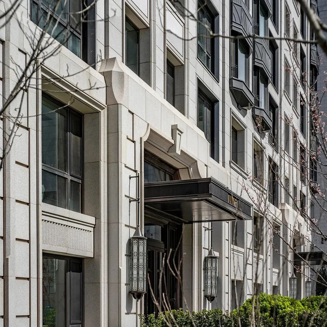 雙層高精裝大堂以古典建筑比例為基調(diào),強調(diào)直線和弧線的結(jié)合,利用石材凹與凸的變化豐富視覺效果,無柱金屬雨蓬及復古燈飾進一步增強精致感。