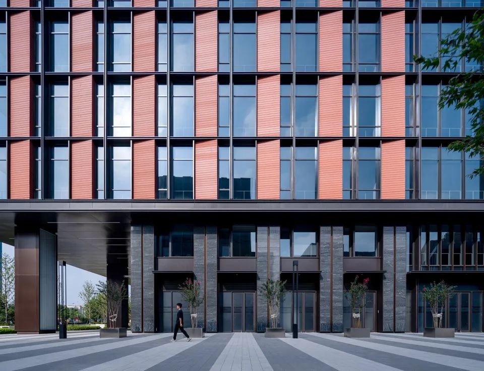 上海虹橋萬創(chuàng)中心立面采用磚紅色的陶板作為主要材料,搭配灰色石材、銅色金屬與少量玻璃幕墻,形成有節(jié)奏的豎窗效果,精致優(yōu)雅,以現(xiàn)代的手法回應(yīng)海派建筑的歷史記憶。