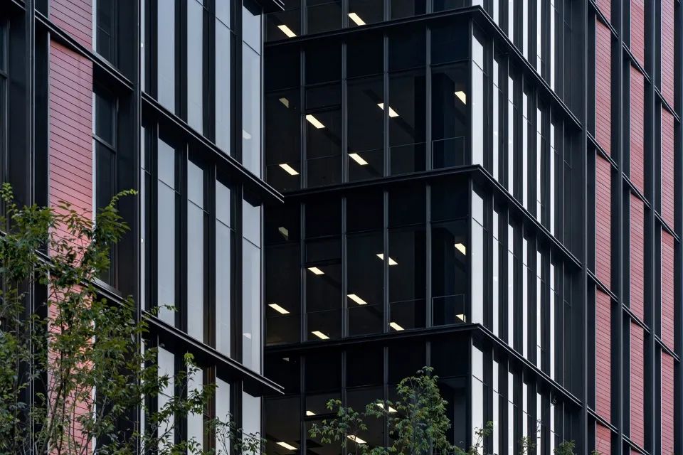 主樓的基座部分采用了黑色的石材和玻璃,從而增加了底部的穩(wěn)重感;中部立面以紅色陶板和玻璃幕墻為主要材質(zhì),呈現(xiàn)出豎向斜面陶板與玻璃幕墻虛實相間的立面效果,并在光影下顯示強烈的韻律感,塑造出對比強烈且極具秩序感的標(biāo)準(zhǔn)段落。