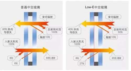 雙層中空LOW-E玻璃特點:可以有效節(jié)能,阻止室外地面、建筑物發(fā)出的熱輻射進入室內(nèi),節(jié)約空調(diào)制冷費用,冬季可以反射熱量,保證室內(nèi)熱量不流失。