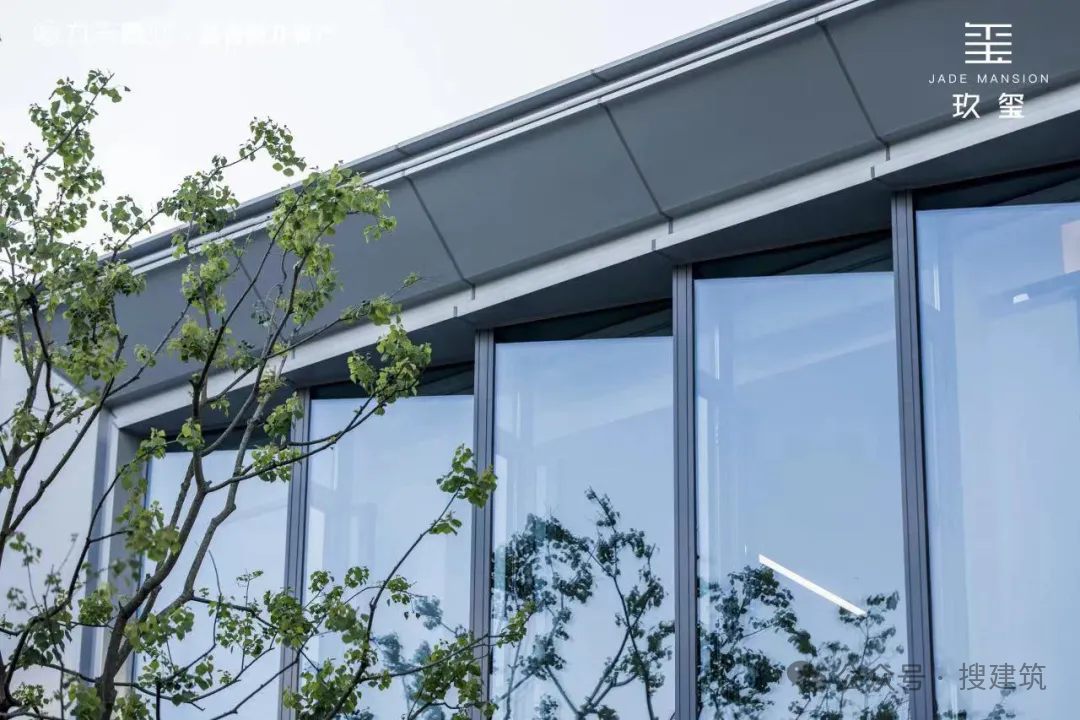 銀灰色鋁板勾勒出建筑形體,木紋色鋁板描畫線條層次,再加上傳統(tǒng)坡屋頂+小披檐元素,讓建筑外立面脫穎而出,不僅提升了整體的顏值和辨識度,更是使得整座建筑更加溫暖,消解了公建化立面的清冷嚴(yán)肅。再加上三玻兩腔Low-E玻璃,其中單塊玻璃的最大觀景尺度,就達(dá)到了235*150cm。打造出“少梁化”的空間營造邏輯,呈現(xiàn)約65%超高窗墻比,使得建筑整體更具通透大氣的現(xiàn)代審美。