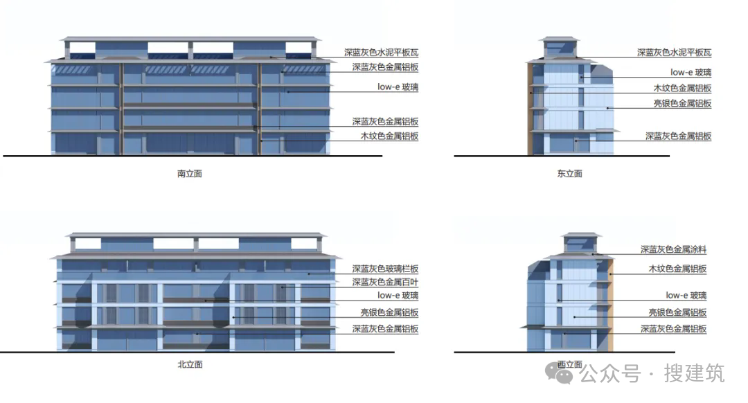 不僅南北立面,是造價昂貴的鋁板外,就連易于忽視的兩側(cè)山墻,同樣也是鋁板等高階型材干掛。