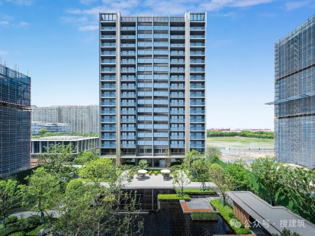 在常見銀色、深灰、米色的外立面顏色中,加入了藍(lán)色進(jìn)行跳色點(diǎn)綴,讓立面更為生動。另外外立面還使用LOW-E灰玻璃與豎向機(jī)翼形圓弧鋁板相交融,擴(kuò)大透光面的同時進(jìn)一步提升了戶與戶之間的隱私性。