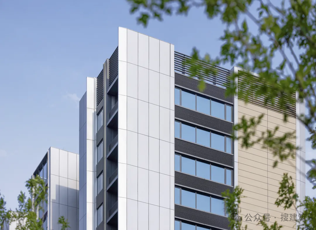 以豎向線條來切分空間和建筑立面,南向立面增加了成本更高、施工難度更大的機(jī)翼形圓弧鋁板,賦予立面更強(qiáng)的造型感和辨識度。