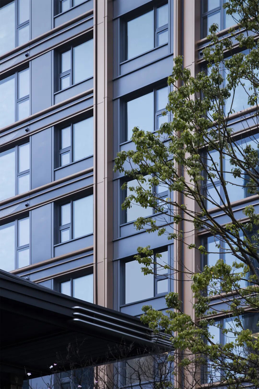 杭州濱江春曼雅廬立面采用了灰色鋁板、暖色木紋鋁板、玻璃等材料搭配,時髦、簡約。