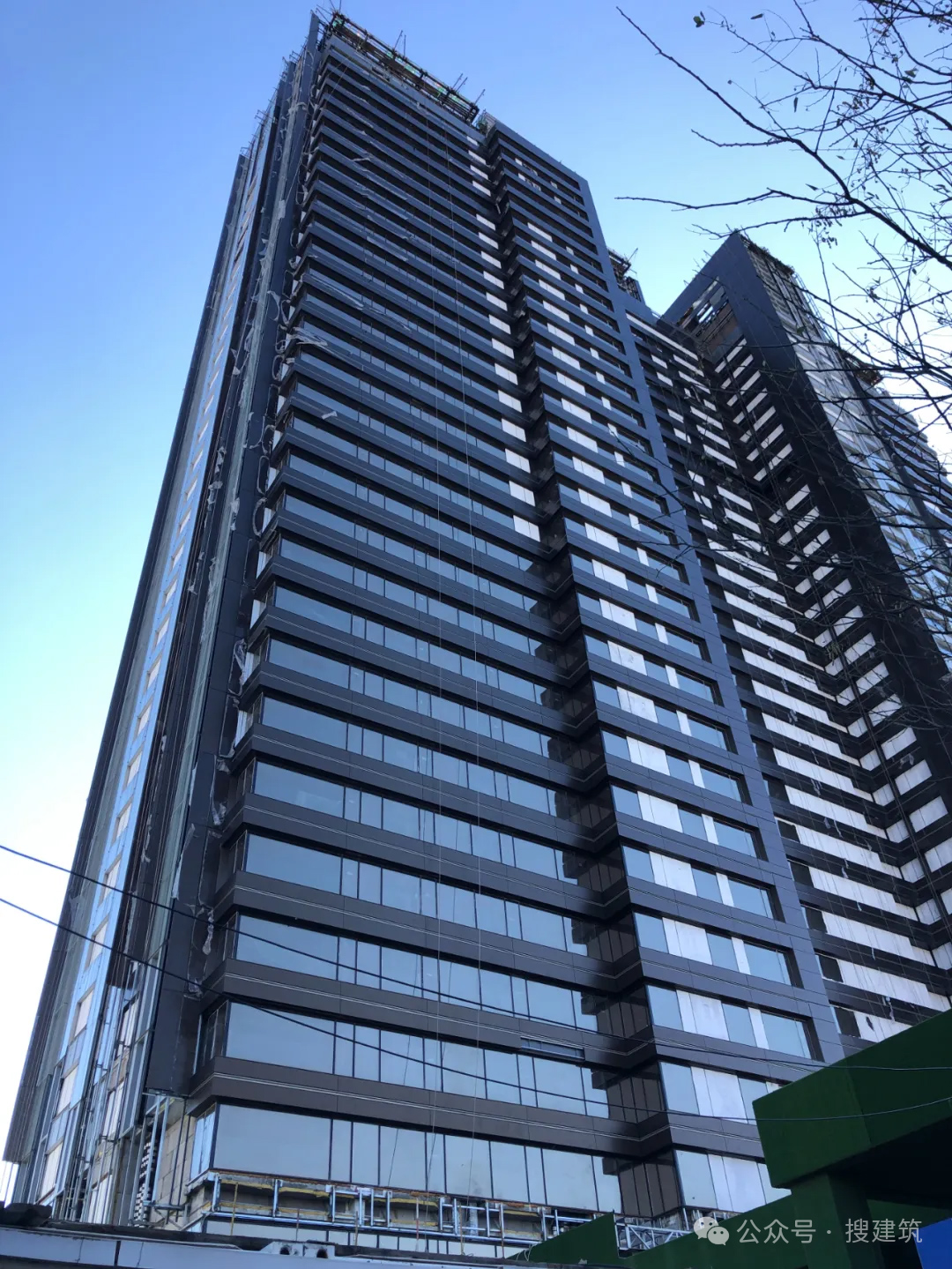 濱江潮語鳴翠由gad張微操刀的外立面:超大玻璃+鋁板,每棟建筑都有一個轉(zhuǎn)角采用成本高昂的曲面玻璃,還纏繞著一圈金色鋁型材挑檐“絲帶”,層間再配以穿孔鋁板。